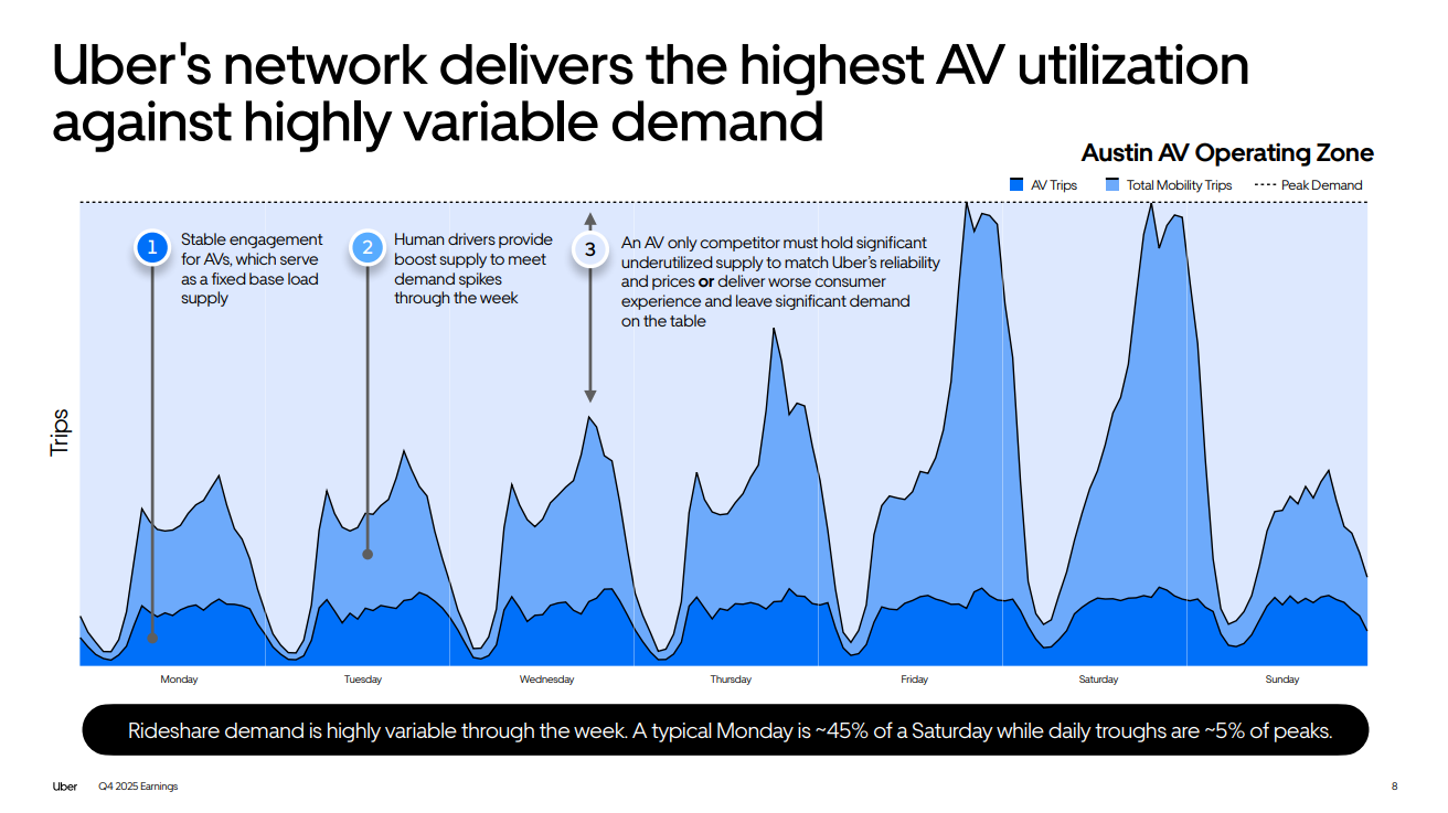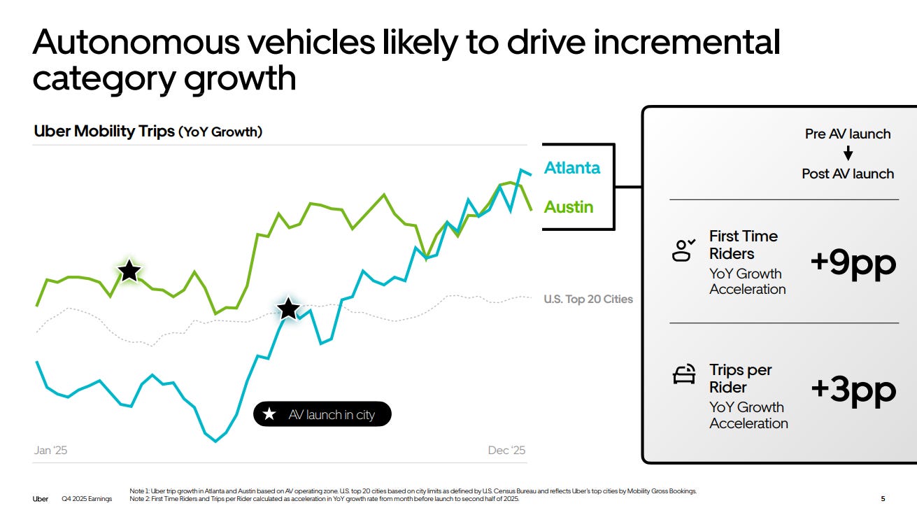 From Uber’s Q4 Earnings: Uber shared early data showing that AV launches accelerated overall usage, particularly among first-time riders, evidence that autonomy is expanding the category. AVs complete 30% more rides per day and arrive 25% faster than human drivers. One open question: given highly variable demand, will it make sense for AV manufacturers to build to peak demand or build to a baseline, with surges being met by traditional drivers?