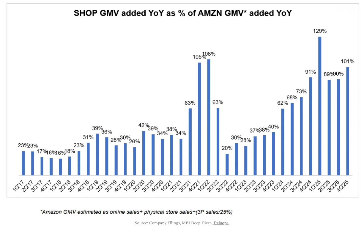 Shopify and the SaaS Panic (Ben Thompson, Stratechery): Shopify posted Q4 revenue of $3.7 billion (up 31% YoY) and $124 billion in gross merchandise volume, both beating estimates. The stock fell 13% after adjusted EPS of $0.48 missing consensus expectations of $0.51. This feels like a SaaSpocalypse panic in miniature: the market is treating every software company as an AI casualty, regardless of whether AI is a headwind or a tailwind. As Ben Thompson eloquently argued on Stratechery last week, Shopify’s logic should run in the opposite direction. Shopify sits atop trillions of data points from billions of transactions across millions of merchants, and it’s deploying that data through Shop Campaigns, a new Product Network that cross-sells inventory across Shopify stores, and the Universal Commerce Protocol co-developed with Google to power agentic commerce.