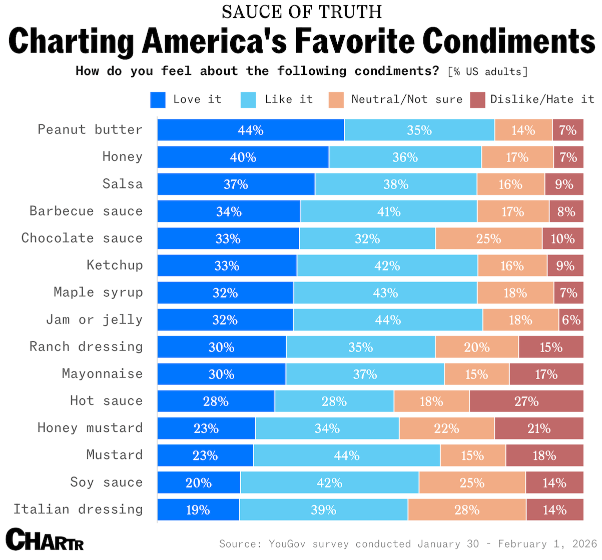 From Sherwood: Despite peanut butter ranking as America’s favorite condiment in a recent YouGov survey, ketchup remains the most ubiquitous, present in ~84% of U.S. households. The category is seeing renewed M&A activity, with Bachan’s acquired by The Marzetti Company and Tapatio by Highlander Partners