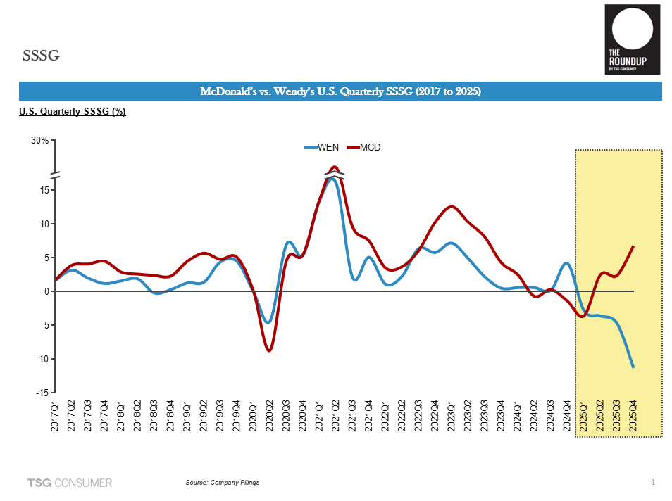 From Sherwood: Wendy’s had a brutal year capped by an even worse Q4, with SSSG of -11.3%. The previous low point was Q2 2020 at -4.4%, during COVID. Compared with McDonald’s recent performance, the contrast underscores how critical sustained innovation is to long-term SSSG