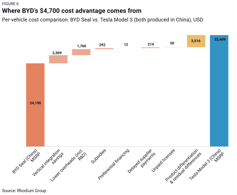 The real advantage is vertical integration. BYD manufactures far more components in-house, avoiding supplier markups worth an estimated $2,369 per vehicle relative to Tesla. The second largest factor is lower overhead per vehicle ($1,766 advantage), largely due to concentrating R&D in China.
